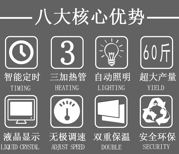 全自動(dòng)烤紅薯設(shè)備采用人性化設(shè)計(jì),多項(xiàng)技術(shù)填補(bǔ)國內(nèi)空白,采用新一代自動(dòng)化、智能化技術(shù)生產(chǎn),具有傳統(tǒng)店鋪無法比擬的優(yōu)勢(shì)。本機(jī)采用高精度上等鋼材,全不銹鋼內(nèi)膽,透明玻璃視窗,寬大的電腦顯示屏,全自動(dòng)控溫,無級(jí)調(diào)速,高效節(jié)能,產(chǎn)量高,款式新穎,外觀精美豪華。