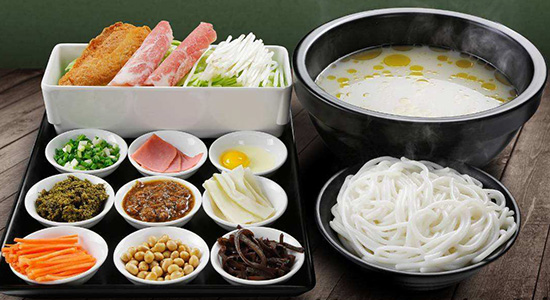 過(guò)橋米線由三部分組成:一是湯,二是切成薄片的各類嫩肉,三是米線和時(shí)鮮蔬菜,制湯考究,選用武定壯母雞、本地老母鴨、筒子骨煨制,制湯的要領(lǐng)是選料講究,原料與水嚴(yán)格按比例投放,中途不準(zhǔn)加水,要用旺火燒開(kāi),撇去浮沫、 改用小火煨制。 鮮湯制好,經(jīng)用精鹽、味精、胡椒粉調(diào)味后,裝碗時(shí)在湯內(nèi)注入熱雞油,油浮在湯的表面起保溫作用。肉片根據(jù)不同價(jià)格檔次分高中和大眾款式。一般檔次有白肉片、火腿片、*脊肉片、腰片等,五種原料分別裝盤(pán)各為一件,高檔有水發(fā)海叁、肚頭、烏魚(yú)片、水發(fā)魷魚(yú)、*脊肉片、鮮雞脯肉片、火腿片等。過(guò)橋米線檔次的高低主要根據(jù)肉片的種類、是否加有海味以及份量的多少、裝盤(pán)的形式而定。除肉類原料外,還有時(shí)鮮蔬菜如豌豆尖、韭菜苔、草芽、蔥花、芫荽末,水發(fā)豆腐皮等。