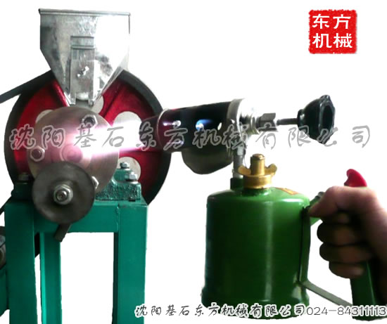 2.開機(jī)前先檢查一下機(jī)頭前面的飛刀,飛刀刀口要離機(jī)頭端面0.1-0.2毫米。可用機(jī)頭前下方的螺帽進(jìn)行調(diào)節(jié),千萬不可緊貼在機(jī)頭的平面上,調(diào)節(jié)螺母一定要擰緊,前端兩只螺母要對(duì)擰擰緊,使飛刀轉(zhuǎn)動(dòng)輕松活絡(luò),必須用噴燈將機(jī)頭預(yù)熱至50-70度,大概5分鐘左右,操作如圖1所示。下軸是飛刀離合器,(剛開機(jī)時(shí),一定要將離合器分離,避免飛刀旋轉(zhuǎn)傷人。)手握離合器前端向外拉,使離合器分離,飛刀不旋轉(zhuǎn)。
