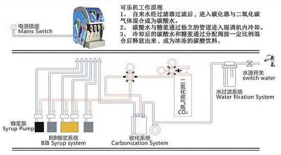 當閥門打開時,經過冰水槽冷卻的碳酸水和糖漿在分配閥的閥嘴處初步混合,在流到杯子中進一步混合形成飲料。分配閥上帶有可以調節糖漿、水流量的調節器,通過調整可以得到所需要的糖水比例。