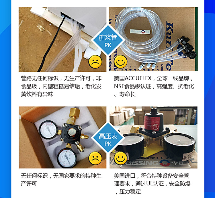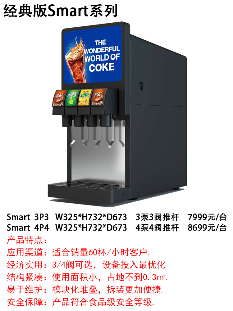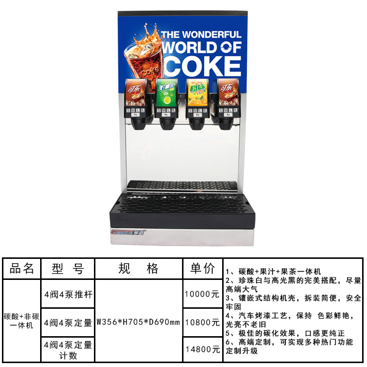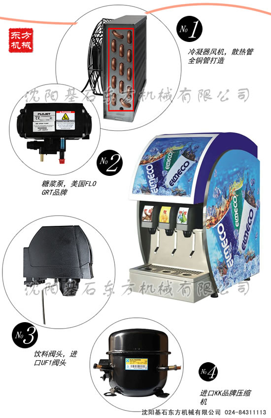 百事可樂機304食品級不銹鋼,飲料閥純正美國制造并原裝進口,壓力泵純正意大利制造并原裝進口,壓縮機采用意大利世界頂級品牌阿斯帕拉。高效靜音型壓縮機、散熱器,特配環保雪種,獨有壓縮機保護裝置,快速啟停,節能省時。