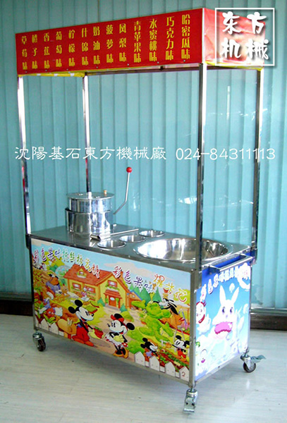 整機(jī)不銹鋼設(shè)計(jì),奪人眼目.爆米花機(jī)和棉花糖機(jī)都可以單獨(dú)控制,互不干擾.均液化氣加熱,交流電或者電瓶帶動旋轉(zhuǎn)和攪拌.頂棚方便拆卸,下有四個(gè)剎車輪,方便流動及作業(yè).棉花糖機(jī)部分有液化氣開關(guān)和電源開關(guān),內(nèi)置充電器,版面含電壓表和電流表,電瓶電量一目了然.最新改進(jìn)鋁盤出糖器,減震結(jié)構(gòu),可隨意放糖,改進(jìn)了以前糖必須放在出糖器中間的問題.可拉絲十米以上,像藝術(shù)表演一樣,引起圍觀和購買狂潮.爆米花機(jī)部分扔采用下攪拌結(jié)構(gòu),電機(jī),減速箱,減速器,攪拌器新升級.