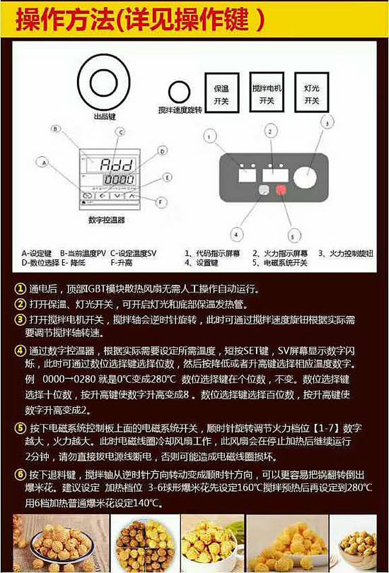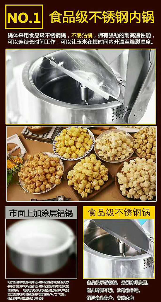 影院專用爆米花機采用加厚不銹鋼鍋體,微電腦自動控溫,一機多用,可做球形、蝶形爆米花。火力調節系統,變頻加熱系統,任何形狀都可以爆。