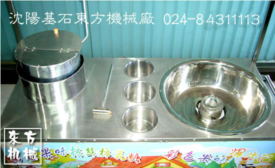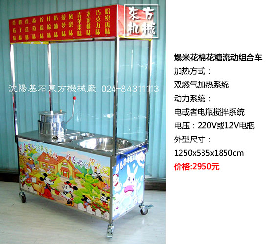 全機不銹鋼設計,奪人眼目.爆米花機和棉花糖機都可以單獨控制,互不干擾.均液化氣加熱,交流電或者電瓶帶動旋轉和攪拌.頂棚方便拆卸,下有四個剎車輪,方便流動及作業(yè).棉花糖機部分有液化氣開關和電源開關,內置充電器,版面含電壓表和電流表,電瓶電量一目了然.最新改進銅盤出糖器,減震結構,可隨意放糖,改進了以前糖必須放在出糖器中間的問題.可拉絲十米以上,像藝術表演一樣,引起圍觀和購買狂潮.爆米花機部分扔采用下攪拌結構,電機,減速箱,減速器,攪拌器2008年均最新升級.