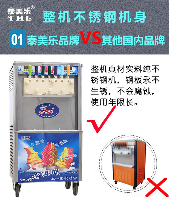 本機為環(huán)保型冰淇淋機,選用日立、三洋、阿斯帕拉、380V美國谷輪CORKEN大功率進口壓縮機.不銹鋼外殼,外觀豪華,遠高于彩色噴涂機器的材質,永遠光亮如新,耐磨損,采用無氟設計,帶高能膨化泵,丹麥進口膨脹閥,冷凝器外轉子風扇電機,風速快,冷凝效果好,省電節(jié)能。全自動電腦控制板,最新液晶顯示功能,自動清洗.電腦計數(shù)功能,免人工,銷售多少,一目了然。自動清洗功能,最大的優(yōu)勢就是制冷速度快,超強的持續(xù)接打能力。
