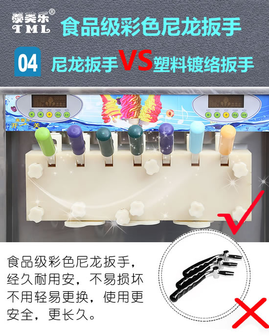 七色冰淇淋機為環(huán)保型冰淇淋機,選用日立、三洋、阿斯帕拉、380V美國谷輪CORKEN大功率進口壓縮機.不銹鋼外殼,遠高于彩色噴涂機器的材質,耐磨損,采用無氟設計,帶高能膨化泵,丹麥進口膨脹閥,冷凝器外轉子風扇電機,風速快,冷凝效果好,省電節(jié)能。
