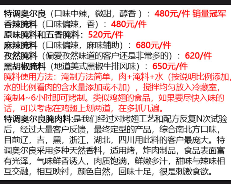 炸雞架專用腌料是我們經過對烤翅工藝和配方反復N次試驗后,經過大量客戶反饋,最終定型的產品,綜合南北方口味,目前遼,吉,黑,浙江,湖北,四川用此料的客戶最龐大。特調奧爾良采用多種天然香料,適用烤,炸肉制品,食品表面富有光澤,氣味鮮香誘人,肉質飽滿,鮮嫩多汁,甜味與辣味相互交融,相互映襯,顏色自然,回味十足,很是刺激食欲。