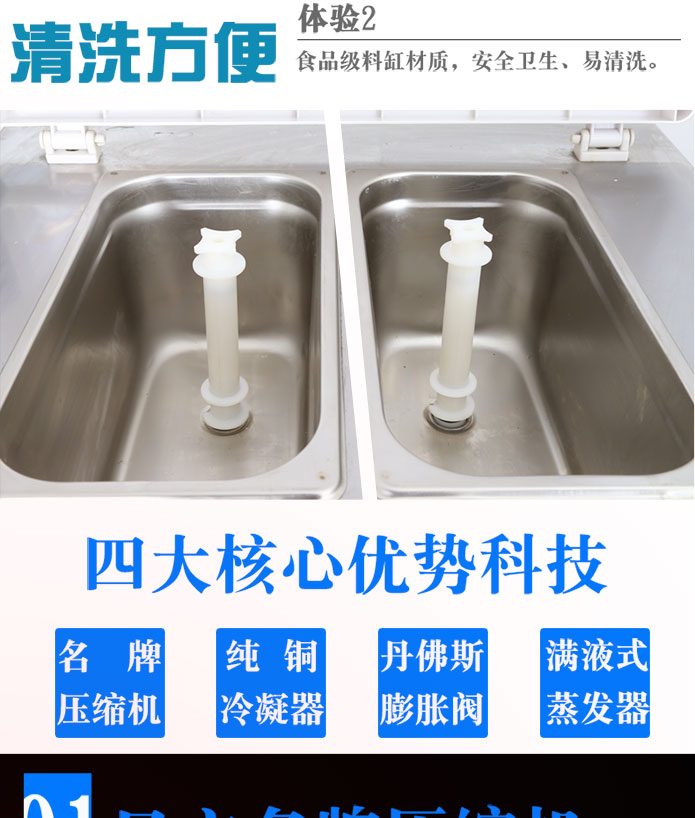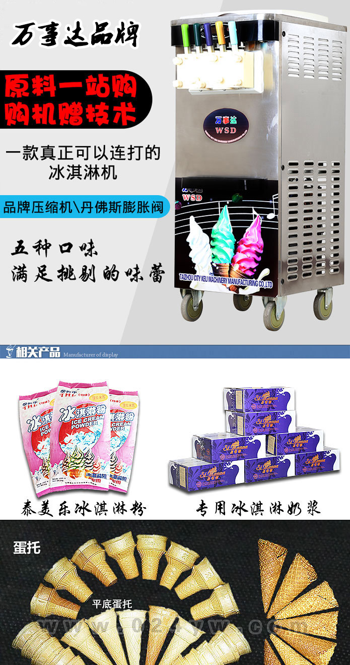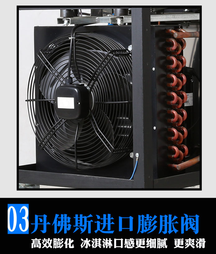 萬事達五色冰淇淋機一體式高密保溫層,集成式智能控制系統,大扭力電機風扇,整機加厚框架,雙電容純銅線電機和純銅管冷凝器,大功能品牌壓縮機,高配置聚集一身.